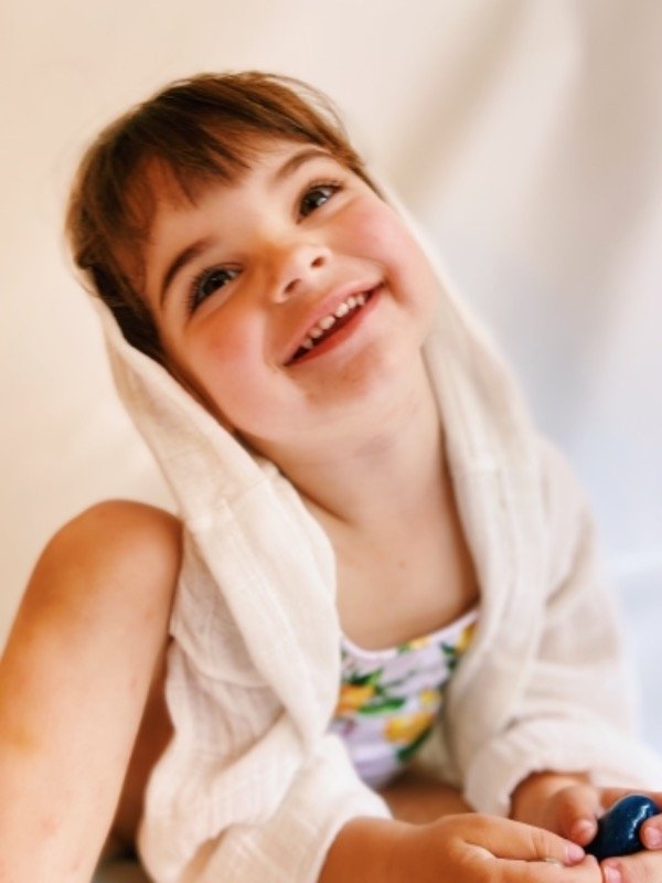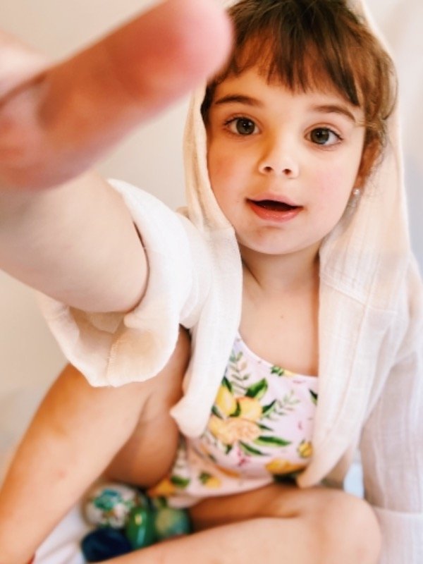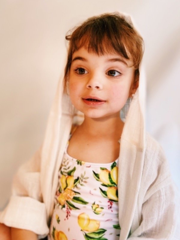 Batita confeccionada en gasa pañalera 100% algodón con borla rústica en la capucha, bolsillos delanteros y lazo en la cintura.