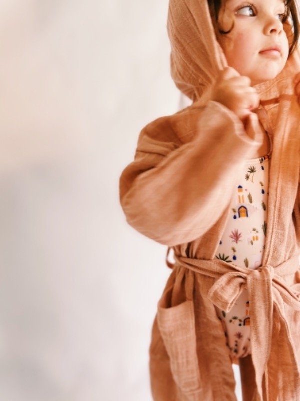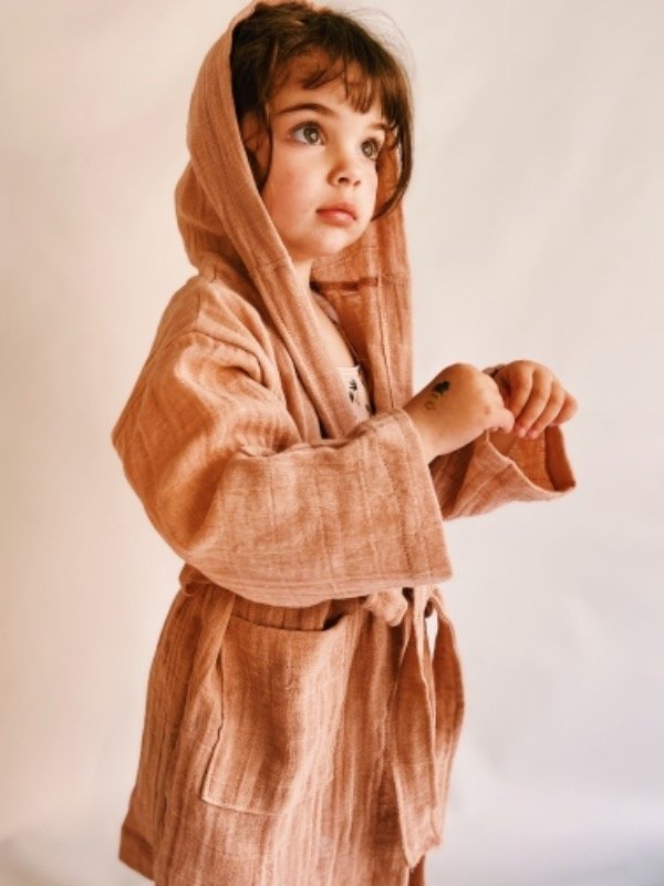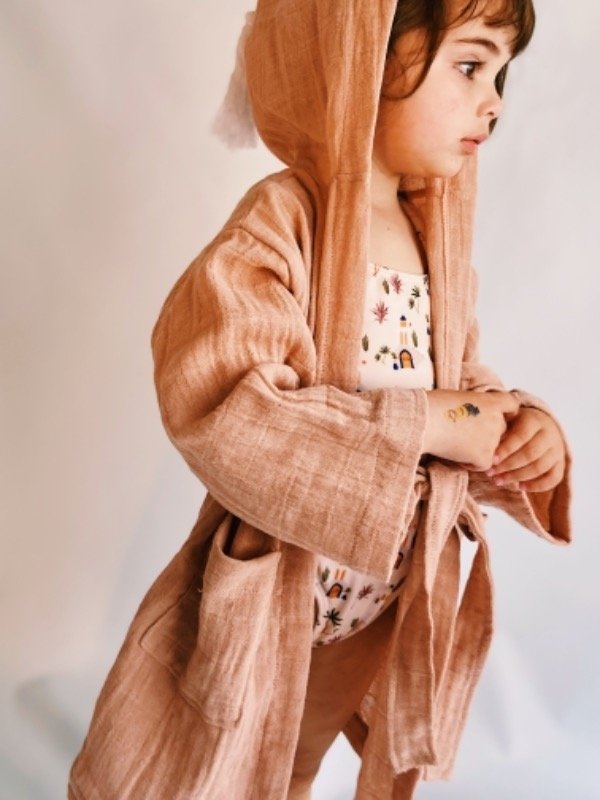 Batita confeccionada en gasa pañalera 100% algodón con borla rústica en la capucha, bolsillos delanteros y lazo en la cintura.